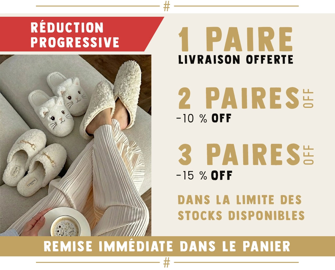Marque basée à Paris Retours sous 30 jours Garantie de 6 mois Paiement 100 % sécurisé Pantoufles ultra douces Support client humanisé Satisfait ou remboursé